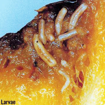 Το έντομο εναποθέτει τα αβγά του (φωτο 1) στη σάρκα των καρπών των φυτών ξενιστών του, ενώ οι προνύμφες (φωτο 2) αναπτύσσονται τρεφόμενες από αυτή. Η νύμφωση γίνεται εντός του εδάφους κάτω από τα φυτά, όπου αναπτύχθηκαν οι προνύμφες και τα ενήλικα (φωτο 3) εμφανίζονται 1 με 2 εβδομάδες αργότερα.