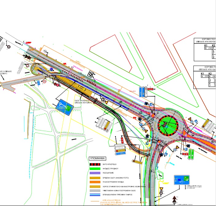 Κατασκευάζεται κεντρική πλακοστρωμένη νησίδα διαχωρισμού των ρευμάτων κυκλοφορίας, λωρίδα εξόδου από το Διαχρονικό Μουσείο και επενδεδυμένη τριγωνική τάφρος στο ρεύμα κυκλοφορίας προς Αθήνα