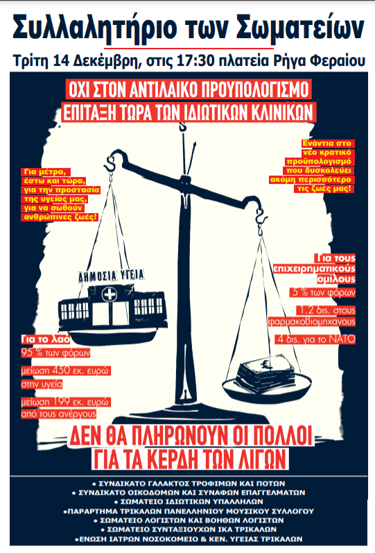 Συλλαλητήριο των Σωματείων Τρικάλων θα πραγματοποιηθεί την Τρίτη 14 Δεκέμβρη, στις 17:30, στην πλατεία Ρήγα Φεραίου για την κατάσταση που επικρατεί στην υγεία εν μέσω πανδημίας αλλά και στην οικονομία.