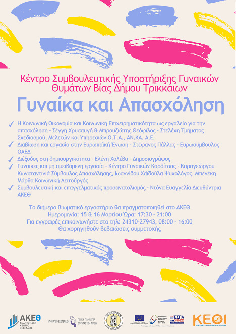 Το Κέντρο Συμβουλευτικής Υποστήριξης Γυναικών Θυμάτων Βίας του Δήμου Τρικκαίων με αφορμή την Ημέρα της Γυναίκας θέλοντας να τιμήσει κάθε μία από εκείνες που εξακολουθούν και αγωνίζονται,  διοργανώνει δωρεάν διήμερο βιωματικό εργαστήριο σε συνεργασία με το ΑΚΕΘ με θέμα: