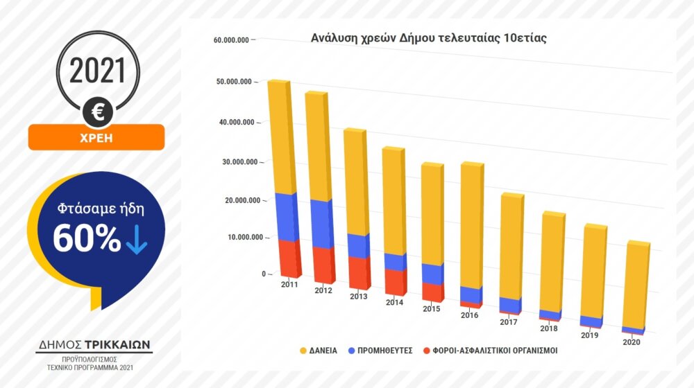 Ταυτόχρονα όμως, η μείωση του χρέους ανήλθες στο εντυπωσιακό 60% περίπου: από σχεδόν 50 εκ. € χρέος το 2011, σε 20 εκ. € το 2020.