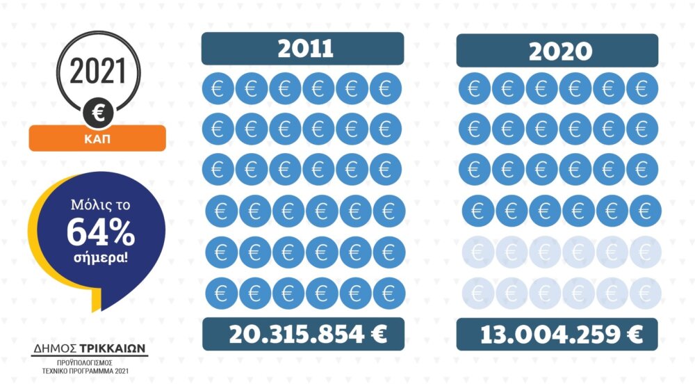 Το δυσθεώρητο χρέος του μειώνει με εντυπωσιακό ρυθμό ο Δήμος Τρικκαίων. Ο Δήμαρχος Δημήτρης Παπαστεργίου το χαρακτήρισε ως «νοικοκύρεμα» – και μάλιστα όλη αυτή τη δεκαετία – καθώς η μείωση αυτή έγινε σε πολύ δύσκολο οικονομικό περιβάλλον: η κρίση και η πανδημία, έχουν μειώσει τους Κεντρικούς Αυτοτελείς Πόρους σε μεγάλο βαθμό. Η μείωση αυτή της κρατικής επιχορήγησης ανέρχεται σε 36% μέσα σε 10 χρόνια: από 20.315.854 € το 2011 σε 13.004.259 € το 2020.