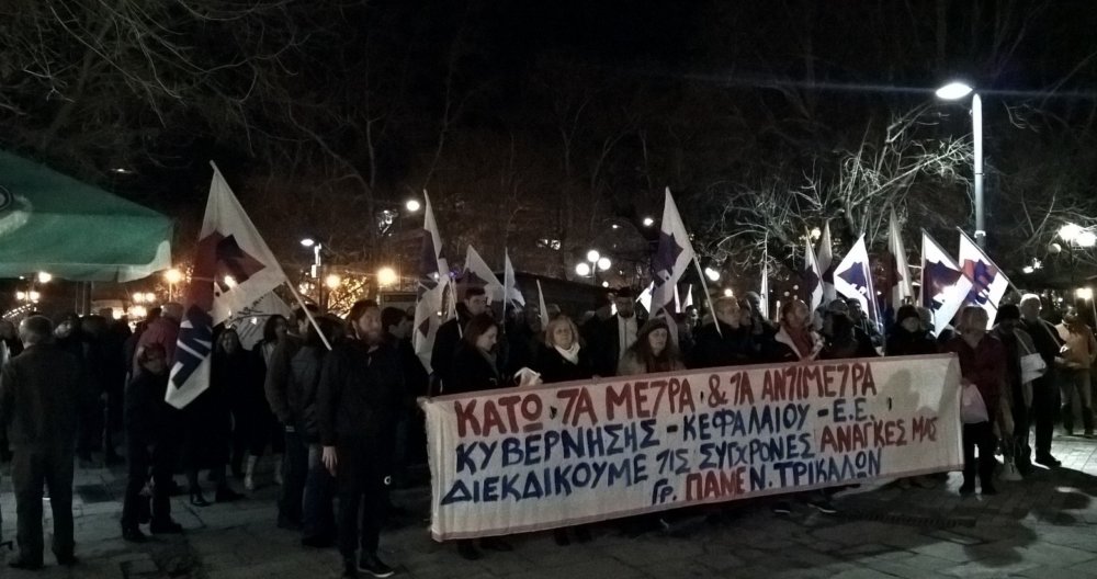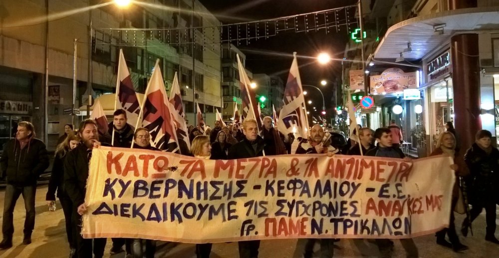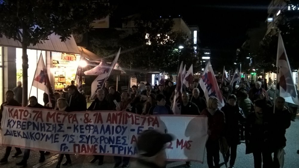 Καλούμε κάθε τίμιο συνδικαλιστή, κάθε εργαζόμενο που έχει επιφυλάξεις ή άλλες προσεγγίσεις, που δεν συμφωνεί σε όλα με το ΠΑΜΕ αλλά παράλληλα δεν αντέχει στη βαρβαρότητα που τσακίζει τη ζωή του και αηδιάζει με τη σαπίλα του ξεπουλημένου εργοδοτικού και κυβερνητικού συνδικαλισμού, να κάνει ένα βήμα μπροστά και να δώσει δύναμη στους αγώνες του, στις διεκδικήσεις του. Να συμπορευτεί με τις δυνάμεις που μπορούν να οργανώσουν την αντεπίθεσή μας.» Τη συγκέντρωση ακολούθησε μαχητική πορεία στους δρόμους των Τρικάλων