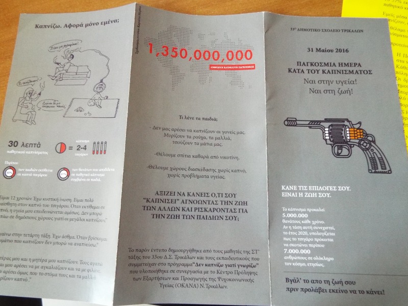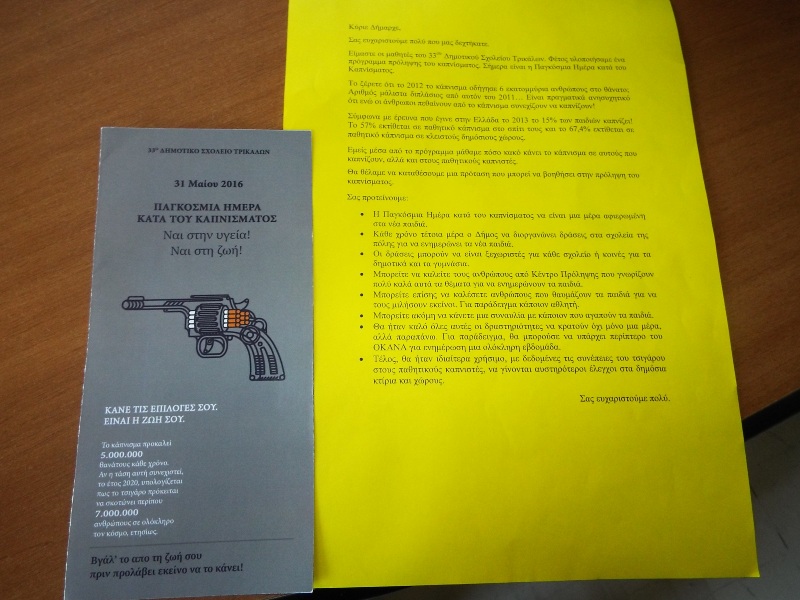 Ναι στη Ζωή, Όχι στο Κάπνισμα, το σύνθημα των μαθητών του 33ου Δημοτικύ Σχολείου Τρικάλων, που το μετέφεραν το πρωί στον Δήμαρχο Τρικκαίων. Από το πρωί σήμερα, οι μαθητές πραγματοποίησαν δράση ενάντια στη βλαβερή συνήθεια του καπνίσματος. Με αφορμή τη σχετική Παγκόσμια Ημέρα, οι μαθητές, σε συνεργασία με το Κέντρο Κοινωνικής Παρέμβασης και βάσει ειδικού προγράμματος για την αποφυγή των εξαρτήσεων, έδρασαν. Στηριζόμενοι από τους δασκάλους, ετοίμασαν ένα φυλλάδιο, το οποίο μοίρασαν σε πολίτες, στον πεζόδρομο της Ασκληπιού.