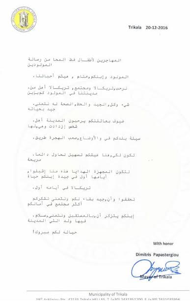 Μέρες Χριστουγέννων 2017 στα Τρίκαλα: δύο προσφυγόπουλα που είδαν το φως της ζωής στη θεσσαλική πόλη, δέχθηκαν τις ευχές του Δήμου Τρικκαίων.