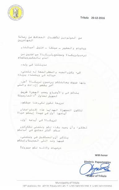 Στη δε επιστολή, που απευθύνεται στα αραβικά και στους γονείς και στα παιδιά, ο κ. Παπαστεργίου τονίζει μεταξύ άλλων: