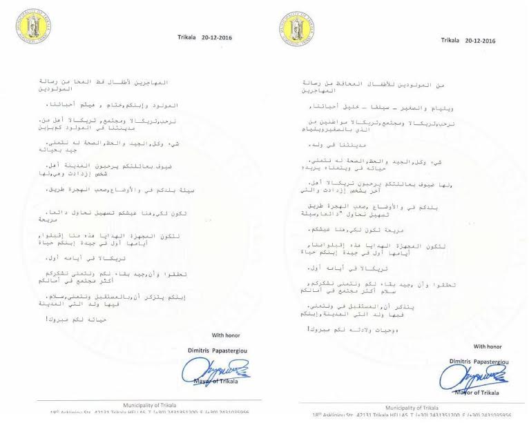 Για αυτό σήμερα 21 Δεκεμβρίου 2016, ο Δήμαρχος Τρικκαίων κ. Δημήτρης Παπαστεργίου, καλωσόρισε τις δύο νέες ζωές στα Τρίκαλα. Με δώρα (ρούχα και κουβερτούλες, ευγενική χορηγία μελών του Εμπορικού Συλλόγου Τρικάλων) και με μια επιστολή – καλωσόρισμα στον Δήμο Τρικκαίων, ο κ. Παπαστεργίου επισκέφθηκε τους οικισμούς στους οποίους διαμένουν οι οικογένειες. Συνοδευόταν από τους αντιδημάρχους κ. Ντίνα Δήμα και Χρήστο Αναστασίου.