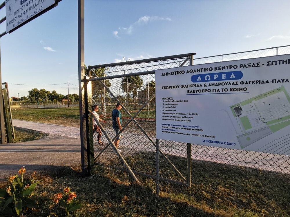 Με συγκίνηση ο δωρητής κ. Γιώργος Φαγκρίδας χαρακτήρισε ως πολύ σημαντική τη συγκεκριμένη ημέρα “για εμένα και τη σύζυγό μου. Μια επιθυμία μας έγινε πραγματικότητα: το αθλητικό κέντρο Ράξας – Σωτήρας”. Τόνισε ότι συνδύασε τη δωρεά με βάση “τις επιθυμίες και τις ανάγκες των παιδιών μας να αθλούνται και να κοινωνικοποιούνται μέσω του αθλητισμού” και “την αθλητική ιστορία του νομού μας, έναν τόπο με τόσο μεγάλη προσφορά σε τόσα αθλήματα”.