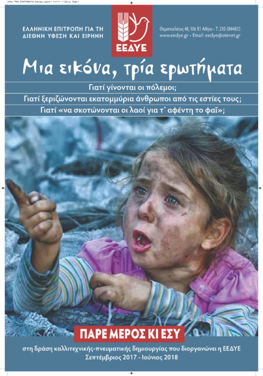 γ) Με επιστολή που απευθύνεται προς τους εκπαιδευτικούς και τους γονείς η ΕΕΔΥΕ διαπιστώνει τη γόνιμη συνεργασία των προηγούμενων χρόνων μεταξύ των σχολικών κοινοτήτων και των Επιτροπών Ειρήνης κατά τόπους καθώς αναπτύχθηκαν θέματα για να εκφραστούν τα παιδιά των Δημοτικών Σχολείων όπως “Μια ζωγραφιά για την ειρήνη” το 2015, “Κανείς δεν επιλέγει να γίνει πρόσφυγας” το 2016, και “Να σκέφτεσαι τους άλλους” το 2017. Η πρωτοβουλία συνεχίζεται για τέταρτη χρονιά προς τα σχολεία με τίτλο “Μια εικόνα, τρία ερωτήματα”: Γιατί γίνονται οι πόλεμοι; Γιατί ξεριζώνονται εκατομμύρια άνθρωποι από τις εστίες τους; Γιατί να σκοτώνονται οι λαοί για τ’ αφέντη το φαί”; Η ιδέα βασίζεται σε μια χαρακτηριστική φωτογραφία παιδιού από εμπόλεμη ζώνη της Μέσης Ανατολής.