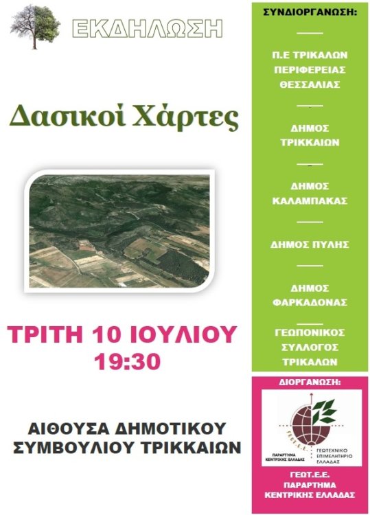 Εκδήλωση για τους δασικούς χάρτες διοργανώνεται στα Τρίκαλα. Μετά την ανάρτησή τους, είναι απαραίτητη η παροχή διευκρινίσεων για όλα τα θέματα που αφορούν τους πολίτες. Για τον λόγο αυτόν, το Παράρτημα Κεντρικής Ελλάδας του ΓΕΩΤΕΕ σε συνεργασία με την Περιφερειακή Ενότητα Τρικάλων, τον Γεωπονικό Σύλλογο Τρικάλων και τους Δήμους Τρικκαίων, Καλαμπάκας, Πύλης & Φαρκαδόνας συνδιοργανώνουν τη σχετική εκδήλωση. Αυτή θα πραγματοποιηθεί την Τρίτη 10 Ιουλίου 2018 και ώρα 19:30 στην αίθουσα Δημοτικού Συμβουλίου του Δήμου Τρικκαίων (Ασκληπιού 18) με θέμα «Ανάρτηση Δασικών Χαρτών». Οι προσκεκλημένοι επιστήμονες θα αναφερθούν σε ζητήματα που χρήζουν προσοχής και θα επιλύσουν απορίες των συμμετεχόντων.