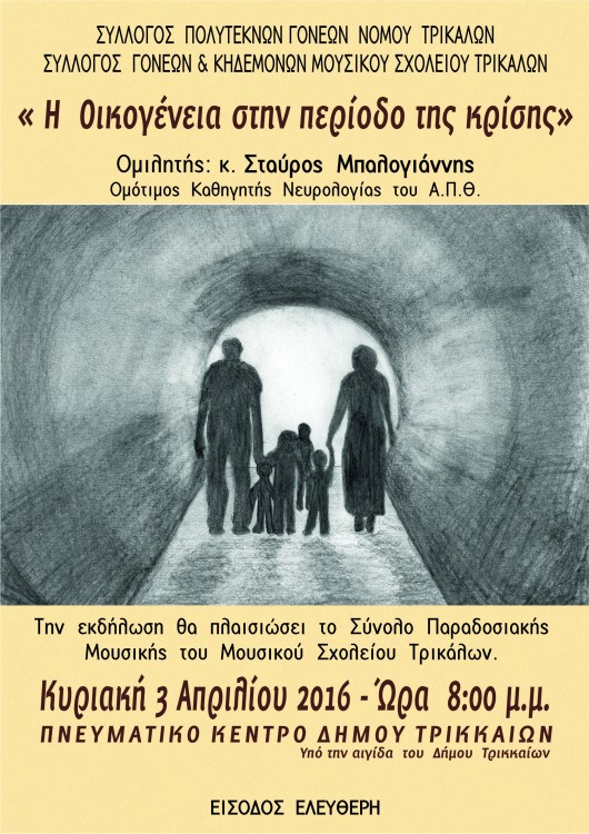 Ο Σύλλογος Πολυτέκνων Ν. Τρικάλων σε συνεργασία με το Σύλλογο Γονέων και Κηδεμόνων του Μουσικού Σχολείου Τρικάλων θα πραγματοποιήσουν εκδήλωση με θέμα: