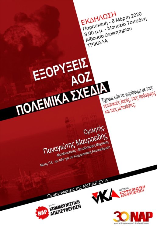 Οι Οργανώσεις Τρικάλων του ΝΑΡ και της νεολαίας Κομμουνιστική Απελευθέρωση διοργανώνουν εκδήλωση την Παρασκευή 6 Μάρτη, στις 8.00 μ.μ., στην Αίθουσα Διοικητηρίου του Μουσείο Τσιτσάνη, με θέμα: «ΕΞΟΡΥΞΕΙΣ, ΑΟΖ, ΠΟΛΕΜΙΚΑ ΣΧΕΔΙΑ. Έχουμε κάτι να χωρίσουμε με τους γειτονικούς λαούς, τους πρόσφυγες και τους μετανάστες;» Ομιλητής: Παναγιώτης Μαυροειδής, Μεταλλειολόγος – Μεταλλουργός Μηχανικός, μέλος Π.Ε. του ΝΑΡ για την Κομμουνιστική Απελευθέρωση.