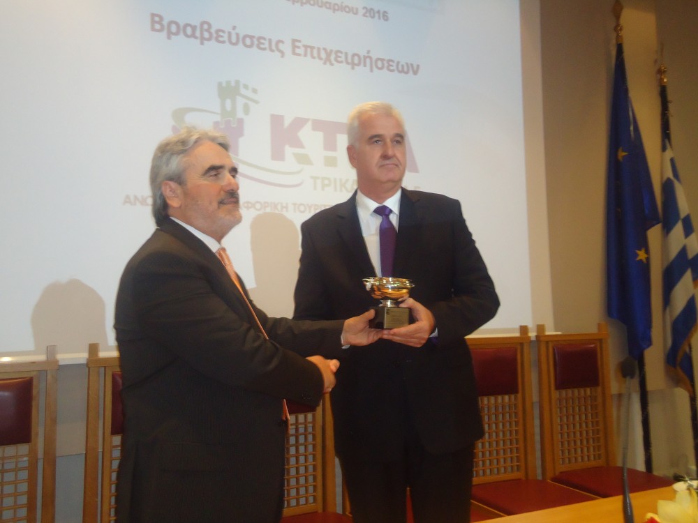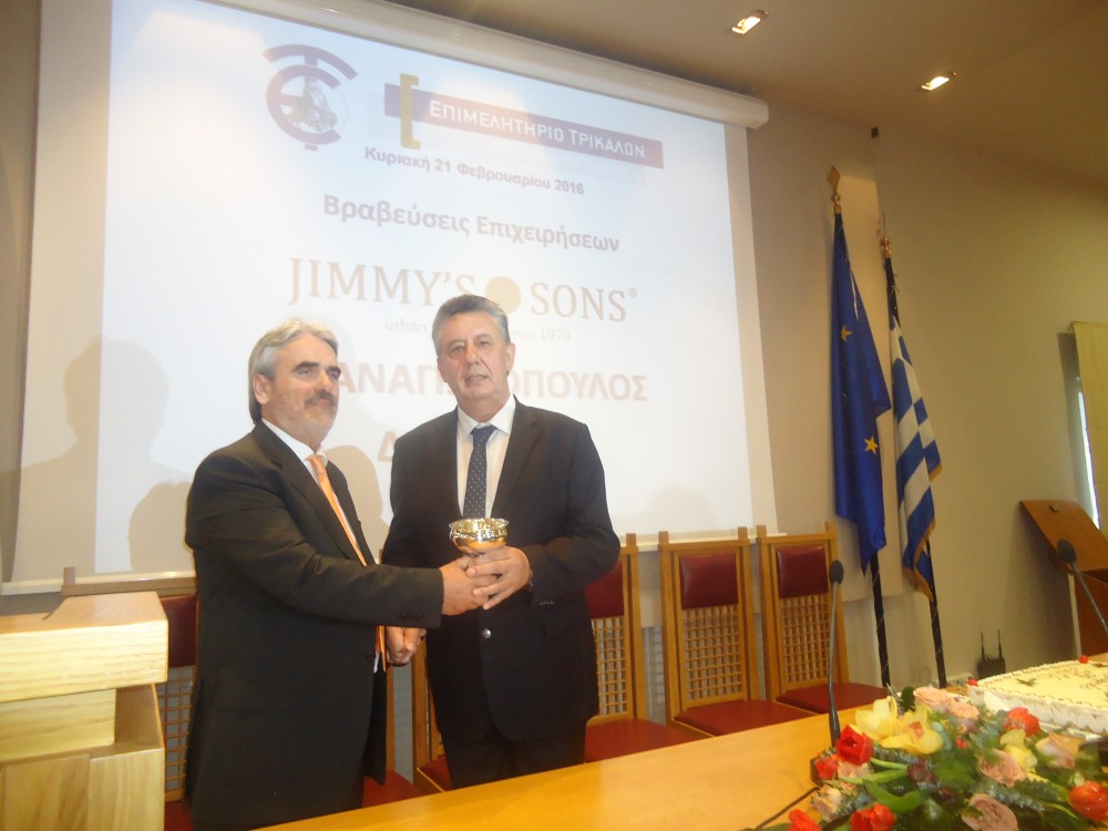 Στη συνέχεια, ο πρόεδρος του τοπικού Επιμελητηρίου προχώρησε στη βράβευση δύο τοπικών επιχειρήσεων, του Υπεραστικού ΚΤΕΛ τρικάλων και του ιδιοκτήτη του φαστ – φουντ jimmy’s, Δημ. Παπαγιωτόπουλου.