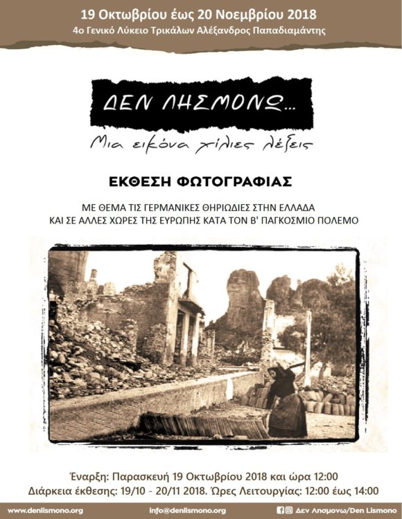 Το 4ο ΓΕΛ Τρικάλων «Αλέξανδρος Παπαδιαμάντης» παρουσιάζει την ιστορική έκθεση φωτογραφίας της Α.Μ.Κ.Ε. με τίτλο «Δεν λησμονώ …μία εικόνα χίλιες λέξεις» με θέμα τις γερμανικές θηριωδίες στην Ελλάδα και σε άλλες χώρες της Ευρώπης κατά τη διάρκεια του Β’ Παγκοσμίου Πολέμου.