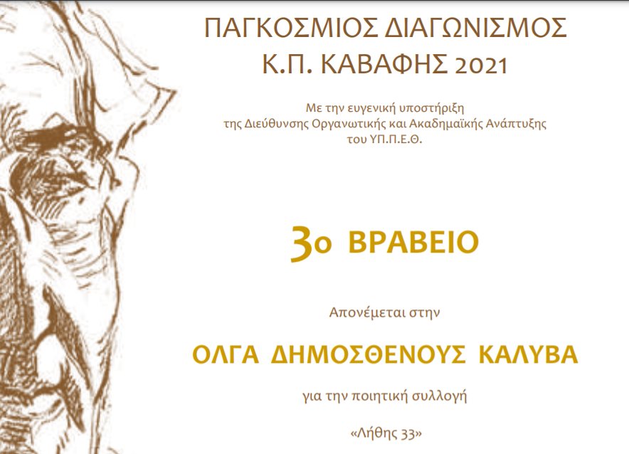 Ακόμη δύο διεθνής διακρίσεις είχε για δυο ποιητικές της συλλογές η Ολγα Καλύβα, που πλέον έχει το δικό της έντονο αποτύπωμα στο χώρο της ποίησης. Ποιο συγκεκριμένα η Ολγα Καλύβα πήρε το 3ο Βραβείο στον 10ο Διεθνή Λογοτεχνικό Διαγωνισμό, έτους 2021 του ομίλου για την UNESCO Τεχνών, Λόγου και Επιστημών Ελλάδος με το ποίημα «ΔΙΑΚΟΣΙΑ ΧΡΟΝΙΑ»,  καθώς και το 3ο βραβείο στον Παγκόσμιο Διαγωνισμό Κ.Π. ΚΑΒΑΦΗΣ 2021 για την ποιητική συλλογή «Λήθης 33»