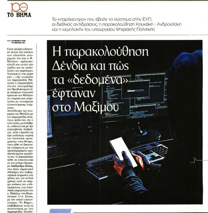 «Η παρακολούθηση Δένδια και πώς τα “δεδομένα” έφταναν στο Μαξίμου» είναι ο χαρακτηριστικός τίτλος του δημοσιεύματος. Όπως σημειώνεται στο δημοσίευμα, το Predator ενεργοποιήθηκε αρχικά σε εγκαταστάσεις της ΕΥΠ στην Αγία Παρασκευή, με αναφερόμενη ενημέρωση του ανιψιού του Κυριάκου Μητσοτάκη και πρώην γραμματέα πρωθυπουργού, Γρηγόρη Δημητριάδη.