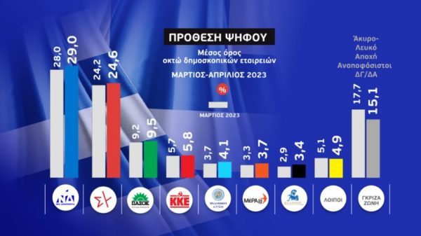 Ειδικότερα, διαφορά 4,4 μονάδων έχει η πρώτη Ν.Δ. από τον δεύτερο ΣΥΡΙΖΑ, όπως δείχνουν τα δεδομένα που έχουν συγκεντρωθεί από οκτώ εταιρείες.