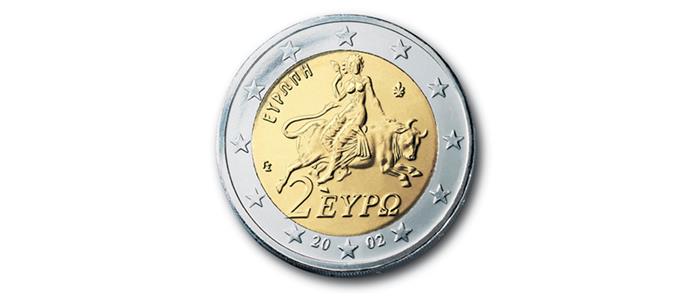 Στο κέρμα των 2 ευρώ, απεικονίζεται σκηνή από ψηφιδωτό που βρέθηκε στη Σπάρτη (3ος αι. μ.Χ.) και αναπαριστά την αρπαγή της Ευρώπης από τον Δία, μεταμορφωμένο σε ταύρο. Η Ευρώπη είναι μια μορφή της ελληνικής μυθολογίας από την οποία πήρε το όνομά της η ήπειρός μας, όπως αναφέρει το Αθηναϊκό Πρακτορείο Ειδήσεων.