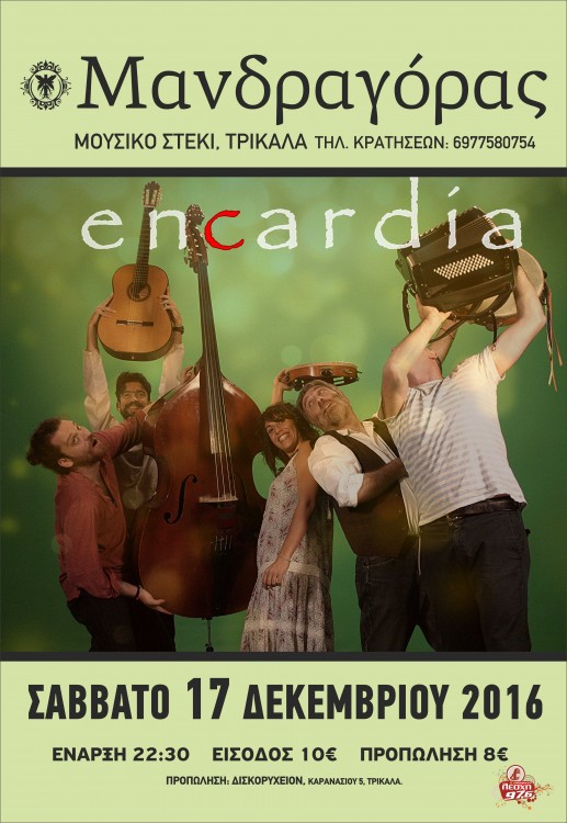 Οι ENCARDIA, η ιδιότυπη και απόλυτα ελκυστική αυτή μουσική κολεκτίβα, αποτελούν την εποχή αυτή ένα από τα πλέον προβεβλημένα και καταξιωμένα στη χώρα και διεθνώς Ελληνικά σχήματα της world μουσικής. Προσηλωμένοι στην πλούσια παραδοσιακή και γεμάτη ενέργεια μουσική της Κάτω Ιταλίας, με τον πειστικό τους τρόπο έκφρασης και απόδοσης της μουσικής, μας ταξιδεύουν μουσικά στα απόμακρα χωριά της Καλαβρίας, στις όμορφες περιοχές του Salento και σ’όλα εκείνα τα μέρη που μιλούν ακόμη Γκρεκάνικα κι άλλες τοπικές διαλέκτους.