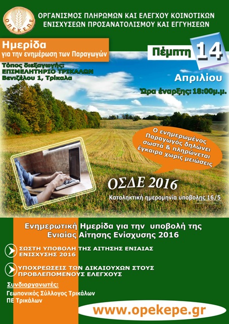 Ο ΟΠΕΚΕΠΕ, η ΠΕ Τρικάλων και ο Γεωπονικός Σύλλογος Τρικάλων, συνδιοργανώνουν ανοιχτή ενημερωτική ημερίδα στα Τρίκαλα την Πέμπτη 14 Απριλίου 2016 και ώρα 18:00 στο Επιμελητήριο Τρικάλων με θέμα: