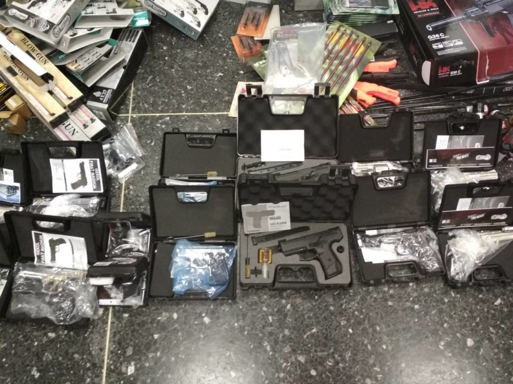 Μεταξύ άλλων βρέθηκαν 20 περίστροφα – πιστόλια γκαζιού – αερίου, 3 αεροβόλα, 6.500 φυσίγγια των 9 mm αβολίδωτα κρότου λάμψης, 21 σπρέι πιπεριού, 2 συσκευές ηλεκτρικής εκκένωσης, 3 μαχαίρια καθώς και διάφορα άλλα είδη τοξοβολίας.