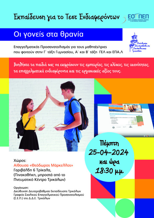 Η Διεύθυνση Δευτεροβάθμιας Εκπαίδευσης Τρικάλων και το Γραφείο Σχολικού Επαγγελματικού Προσανατολισμού (Σ.Ε.Π.) της Δ.Δ.Ε. Τρικάλων, θα πραγματοποιήσουν ενημερωτική – επιμορφωτική συνάντηση με γονείς της Γ΄ τάξης Γυμνασίου, Α΄ και Β΄ τάξης ΓΕΛ και ΕΠΑ.Λ, στην αίθουσα «Θεόδωρος Μάρκελλος», Γαριβάλδη 6 Τρίκαλα, (Πινακοθήκη, μπροστά από το Πνευματικό Κέντρο Τρικάλων) στις 25-04-2024 ημέρα Πέμπτη και ώρα 18:30 με στόχο να εκπαιδευτούν στην διαδικασία εγγραφής (register) αλλά και στην ερμηνεία του δωρεάν Τεστ Ενδιαφερόντων του Εθνικού Οργανισμού Πιστοποίησης Προσόντων και Επαγγελματικού Προσανατολισμού ( Ε.Ο.Π.Π.Ε.Π.).