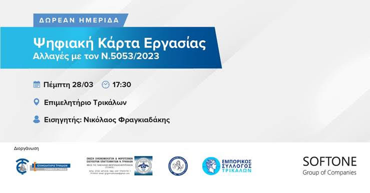 Το Επιμελητήριο Τρικάλων, η Ένωση Οικονομολόγων & Φοροτεχνών Ελευθέρων Επαγγελματιών Ν. Τρικάλων, η Ομοσπονδία ΕΒΕ Τρικάλων και ο Εμπορικός Σύλλογος Τρικάλων, σας προσκαλούν στην ημερίδα που συνδιοργανώνουν με θέμα: «Ψηφιακή Κάρτα Εργασίας και οι αλλαγές με τον Ν. 5053/2023», την Πέμπτη 28 Μαρτίου 2024 και ώρα 17:30 στην αίθουσα εκδηλώσεων του Επιμελητηρίου Τρικάλων (Βενιζέλου 1, 1ος όροφος).