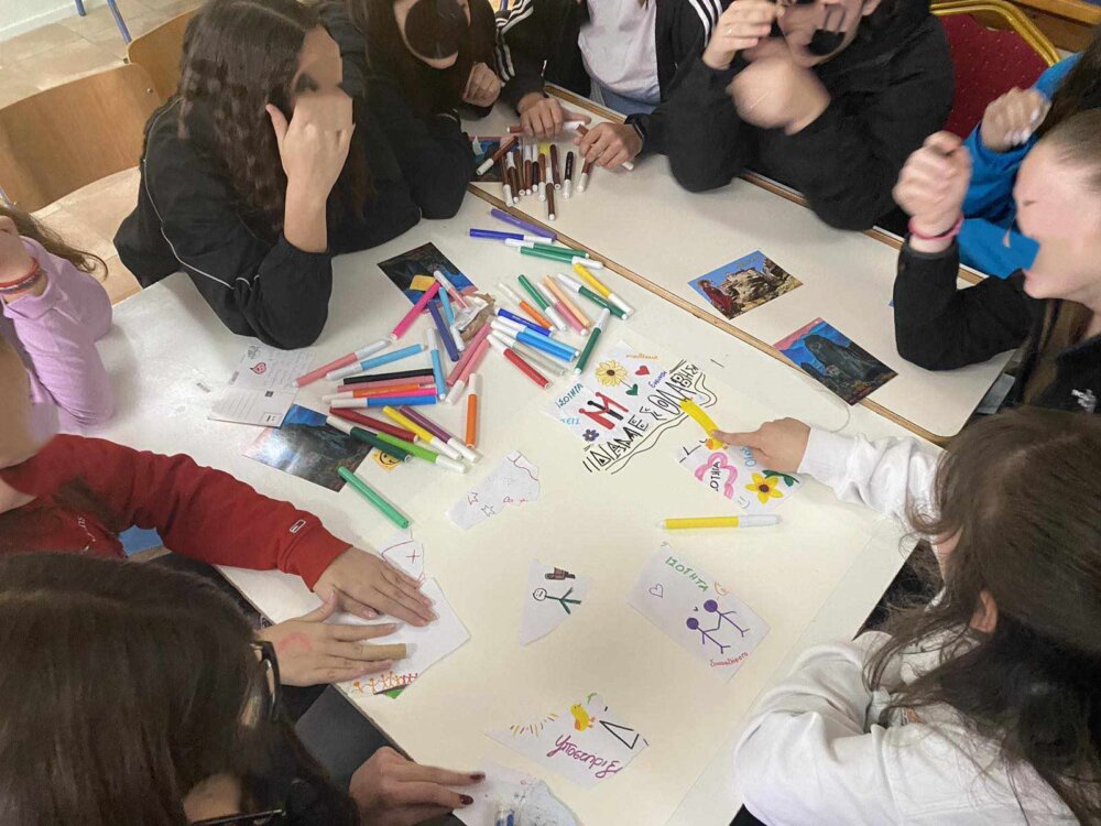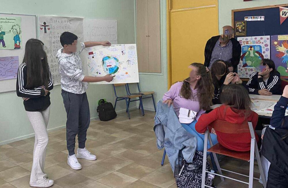 Η Διεύθυνση και η υποδιεύθυνση του 1ου Γυμνασίου Καλαμπάκας, οι υπεύθυνοι εκπαιδευτικοί, Μανάφα Μεταξούλα, ΠΕ78, Γκαντή Βασιλική, ΠΕ04.01, Γκιάτα Βασιλική, ΠΕ02 και η ομάδα Διαμεσολάβησης μαθητών/τριών, αφού μας υποδέχτηκαν θερμά, μας οδήγησαν στην αίθουσα των εργαστηρίων όπου για ένα δίωρο μέσα από την υλοποίηση βιωματικών και δημιουργικών δραστηριοτήτων αναδείξαμε και επικοινωνήσαμε σκέψεις και συναισθήματα για την έννοια και τα οφέλη της Σχολικής Διαμεσολάβησης. Με σύμμαχο μας τη ζωγραφική, περάσαμε από την ‘καταστροφή’ στη ‘δημιουργία’ και συνειδητοποιήσαμε πόσο σημαντικό είναι να λύνουμε τις διάφορές μας ειρηνικά και δημιουργικά. Οι μαθητές και οι μαθήτριες και των δύο σχολείων συνεργάστηκαν αρμονικά σε ομάδες, γνωρίστηκαν και αντάλλαξαν γνώσεις, εμπειρίες και αναμνηστικά δωράκια. Διαπιστώσαμε την ανάγκη για συνεχή επικοινωνία και διασύνδεση και ανανεώσαμε το ραντεβού μας για την επόμενη σχολική χρονιά. Στο τέλος της συνάντησης, απολαύσαμε τα υπέροχα εδέσματα που ετοίμασαν οι εκπαιδευτικοί, οι οικογένειες των μαθητών/τριών και ορισμένοι σχολικοί διαμεσολαβητές.