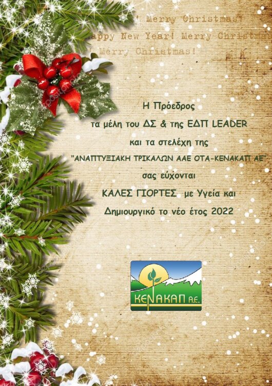 Η πρόεδρος , τα μέλη του Δ.Σ. & της Ε.Δ.Π. Leader και τα στελέχη της “Αναπτυξιακή Τρικάλων ΑΑΕ ΟΤΑ – ΚΕΝΑΚΑΠ ΑΕ” σας εύχονται Καλές Γιορτές με Υγεία και Δημιουργικό το νέο έτος 2022.