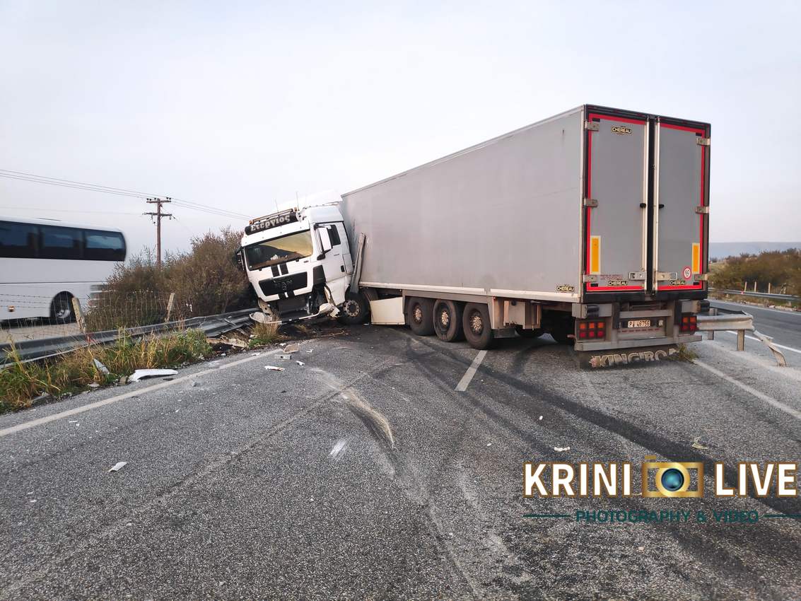 Όπως καταγράφει η τοπική εφημερίδα Κρήνη Live, η Νταλίκα η οποία κινούνταν από τη Λάρισα προς τα Τρίκαλα, εξετράπη της πορείας της, προσέκρουσε στις προστατευτικές μπάρες, πέρασε στο αντίθετο ρεύμα ξηλώνοντας τα κιγκλιδώματα για πολλά μέτρα και παραμένει μέχρι αυτή τη στιγμή ακινητοποιημένη, στην εθνική οδό.