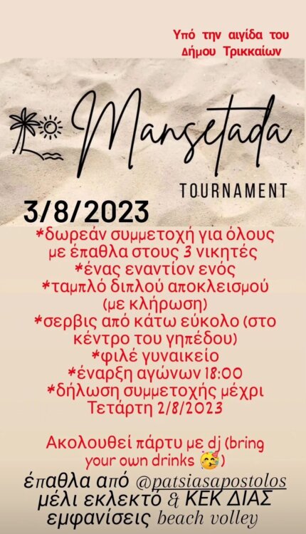 Ξεκίνησαν για το 2023 οι φιλικοί αγώνες και τουρνουά μπιτς βόλεϊ στα Τρίκαλα. Το φιλικό τουρνουά με τον τίτλο «Mansetada 2023» διεξάγεται την Πέμπτη 3/8/2023 στα γήπεδα του πάρκου Άη Γιώργη, υπό την αιγίδα του Δήμου Τρικκαίων, με την ευγενή παραχώρηση χώρων από την «Αστική Ανάπτυξη Α.Ε.».