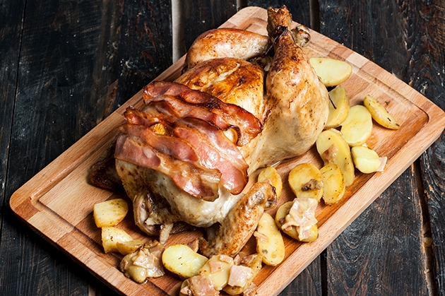 Τελος σκεπάζουμε το στήθος του πουλερικού με τις φέτες μπέικον ώσπου να καλυφθεί τελείως. Αυτό θα προστατέψει την πέτσα από το ψήσιμο και θα λιπαίνει το πουλερικό για μείνει ζουμερό και να παραμείνει τρυφερό μετά το ψήσιμο.