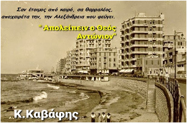 Ο εμβληματικός τίτλος του ποιήματος του Καβάφη με κυρίαρχη θέση το απαρέμφατο απολείπειν σηματοδοτεί και προοικονομεί την εγκατάλειψη του Ρωμαίου στρατηγού Αντωνίου από τον θεό και την αναπόφευκτη ήττα και το τέλος του. Στο υπόλοιπο ποίημα αναπτύσσεται σε προτρεπτικό τόνο η ψύχραιμη αποδοχή της πραγματικότητας χωρίς αυταπάτες και παρακλητικές ικεσίες. Προέχει η στωϊκότητα και η αξιοπρέπεια στην ώρα της πτώσης και της απώλειας σημαντικών πραγμάτων της ζωής μας.