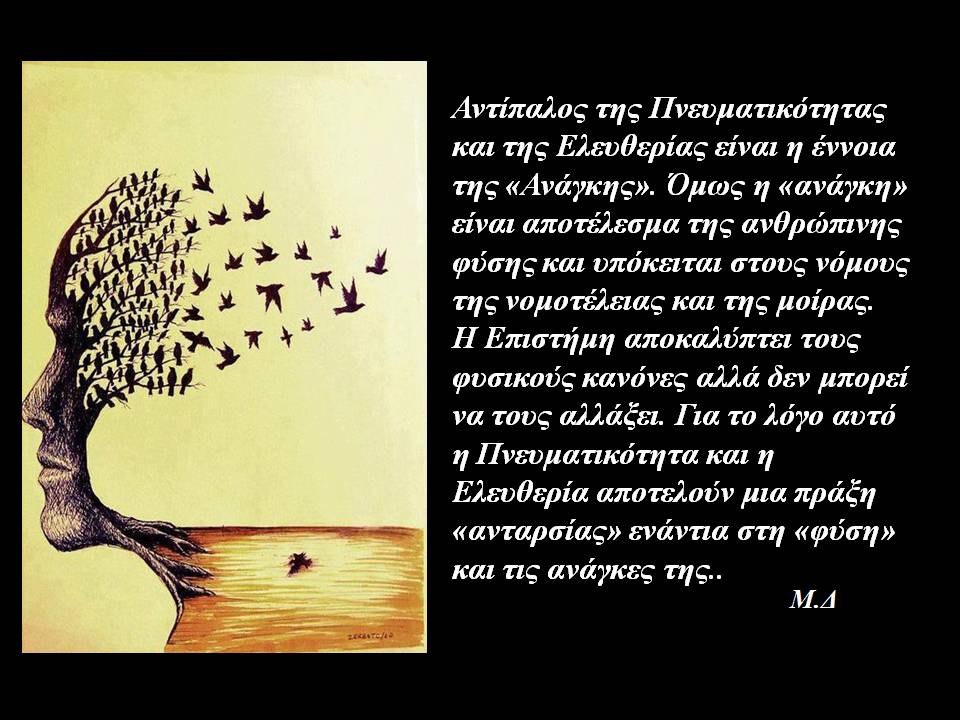 Αμετάθετο, λοιπόν, χρέος του ανθρώπου είναι να διεκδικεί την ελευθερία του υπερβαίνοντας τις αναγκαιότητες μέσα από την υποταγή του σε αυτές, όσο κι αν αυτό συνιστά ένα λογικό και φιλοσοφικό οξύμωρο. Η άλλη ελευθερία, η απόλυτη και εξιδανικευμένη υπάρχει μόνο στη φαντασία μας και σε κάποιους στίχους ποιητών ή τραγουδιών, όπως: