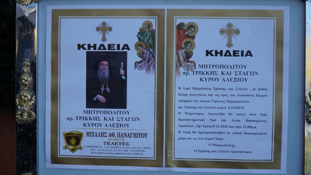 Αλεξίου του Σεβασμιωτάτου και Θεοπροβλήτου Μητροπολίτου της Αγιωτάτης Μητροπόλεως Τρίκκης και Σταγών, ημών δε Πατρός και Ποιμενάρχου, αιωνία η μνήμη. Αμήν».