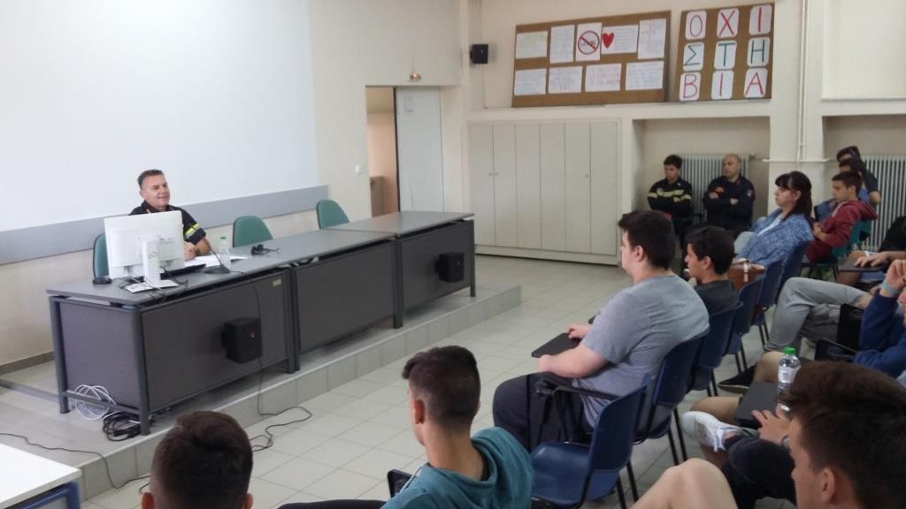 Ο επιπυραγός κος Δημήτριος Παπαγεωργίου έκανε μια ενδελεχή ενημέρωση πάνω στις αιτίες πρόκλησης πυρκαγιών και στους τρόπους αντιμετώπισής τους και έδωσε κατάλληλες συμβουλές ασφαλείας που πρέπει να τηρούν οι μαθητές όταν ασκήσουν το επάγγελμά τους στη δικιά τους επιχείρηση με την αποφοίτησή τους από το σχολείο.