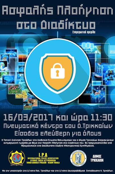 Ημερίδα για την ασφαλή πλοήγηση στο διαδίκτυο, διοργανώνει η Τοπική Διοίκηση Τρικάλων της Διεθνούς Ένωσης Αστυνομικών (I.P.A.) σε συνεργασία με τον Δήμο Τρικκαίων, και την υποστήριξη της Διεύθυνσης Δευτεροβάθμιας Εκπαίδευσης Νομού Τρικάλων και της Διεύθυνση Αστυνομίας Τρικάλων. Η ημερίδα διοργανώνεται διότι τα μέλη της Τοπικής Διοίκησης, όπως αναφέρουν σχετικά, αντιλαμβάνονται «τις σύγχρονες προκλήσεις της ηλεκτρονικής εποχής που ζούμε και τους κινδύνους που εγκυμονούνται από τη χρήση του διαδικτύου, αλλά και γνωρίζοντας τον επαγγελματισμό που διακατέχει τους αστυνομικούς της Δ/νσης Δίωξης Ηλεκτρονικού Εγκλήματος της Ελληνικής Αστυνομίας». Η εκδήλωση θα πραγματοποιηθεί την ερχόμενη Πέμπτη 16 Μαρτίου 2017 και ώρα 11.30, στο Πνευματικό Κέντρο του Δήμου Τρικκαίων, είναι ανοικτή σε όλους (πολίτες – φορείς – αστυνομικούς – μαθητές κ.λπ.)και έχει ως τίτλο «ΑΣΦΑΛΗΣ ΠΛΟΗΓΗΣΗ ΣΤΟ ΔΙΑΔΙΚΤΥΟ». Ομιλητές θα είναι αξιωματικοί της Δ/νσης Δίωξης Ηλεκτρονικού Εγκλήματος, που θα αναφερθούν στα φαινόμενα διαδικτυακής βίας, στους κινδύνους που ελλοχεύουν στις ιστοσελίδες κοινωνικής δικτύωσης και γενικά στην πρόληψη και την αντιμετώπιση των κινδύνων που σχετίζονται με τις νέες τεχνολογίες.