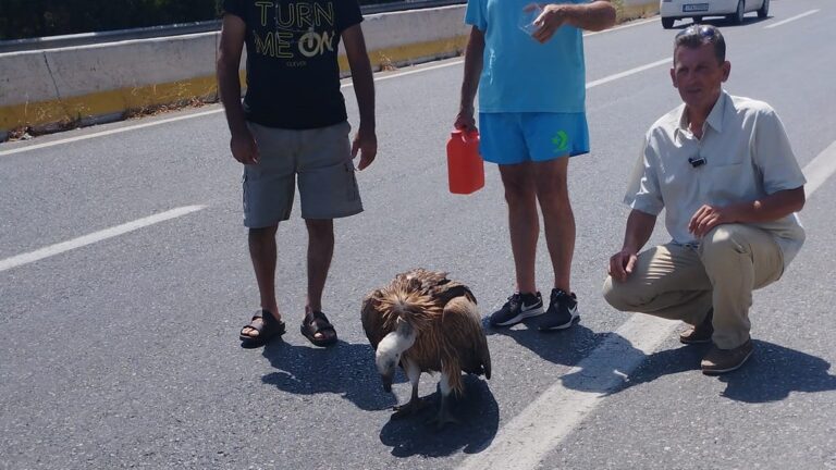 Ένας γυπαετός, ζαλισμένος πιθανόν από τις πολύ υψηλές θερμοκρασίες… προσγειώθηκε στη μέση του δρόμου αδυνατώντας να πετάξει.