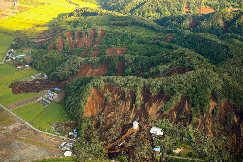 Φωτογραφίες που ελήφθησαν από αεροπλάνα δείχνουν βουνά να έχουν κυριολεκτικά κοπεί στα δυο από τεράστιες κατολισθήσεις, που παρέσυραν δέντρα και βύθισαν στο χώμα κατοικίες. Οι πυροσβέστες απομάκρυναν ένα μέρος των κατοίκων, αλλά εξακολουθεί να αγνοείται η τύχη 31 ανθρώπων, σύμφωνα με το δημόσιο τηλεοπτικό δίκτυο NHK.