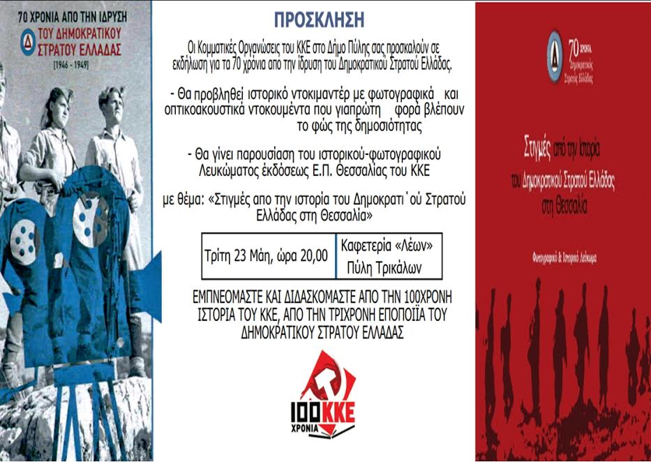 Οι Κομματικές Οργανώσεις του ΚΚΕ στο δήμο Πύλης διοργανώνουν ιστορικοπολιτική εκδήλωση , με αφορμή τα 70 χρόνια από την ίδρυση του Δημοκρατικού Στρατού Ελλάδας.