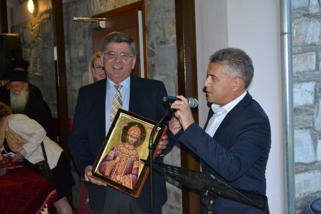 Τις ευχαριστίες του σε όσους συνέβαλα εξέφρασε και ο Δήμαρχος Καλαμπάκας Χρήστος Σινάνης που αμέσως μετά χάρισε στον κ. Αγοραστό μία εικόνα του Αγίου Κωνσταντίνου στον κ. Αγοραστό, οποίος με όσους συνέβαλαν έκοψε μαζί την κορδέλα.