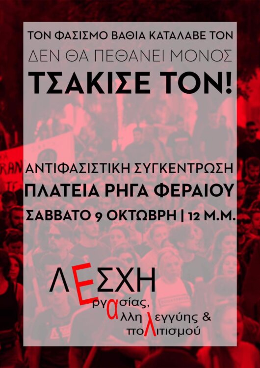 αντιφασιστική συγκέντρωση το Σάββατο 9 Οκτώβρη στις 12 το μεσημέρι στην πλατεία Ρήγα