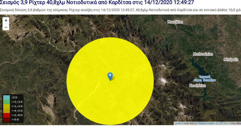 Σεισμική δόνηση 3,9 βαθμών της κλίμακας Ρίχτερ συνέβη στις 14/12/2020 12:49:27, 40,8χλμ Νοτιοδυτικά από Καρδίτσα και σε εστιακό βάθος 10,0 χιλιομέτρων, που έγινε αισθητός και στα Τρίκαλα. Νεότερα σε λίγο.