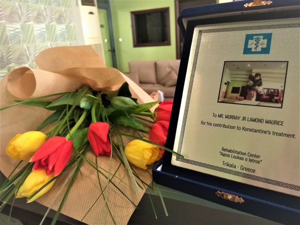 Σαν ελάχιστη ανταπόδοση η Ιατρός κ. Κλειτσάκη Αγγελική, εκπροσωπώντας όλο το προσωπικό του πρόσφερε μία ανθοδέσμη και μία αναμνηστική πλακέτα με φωτογραφία του ίδιου και του Κωνσταντίνου.