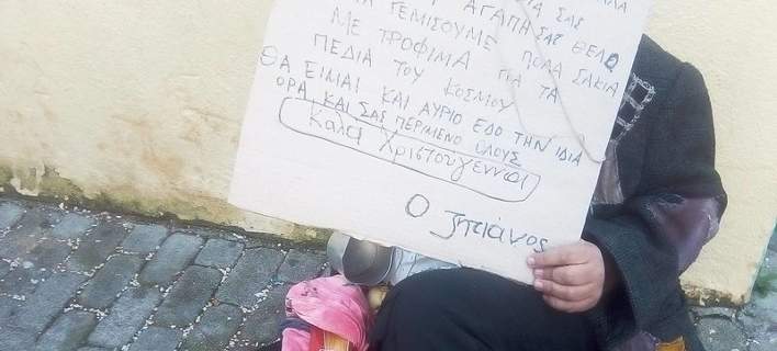 Με παλιά ρούχα, σχεδόν κουρέλια, ρακένδυτος, καθόταν το πρωί έξω από το σχολείο, κρατώντας μια πινακίδα που έγραφε με αρκετά ορθογραφικά λάθη «Δεν θέλω τη λύπη σας, αλλά ούτε τα λεφτά σας, μόνο την αγάπη σας θέλω, για να γεμίσουμε πολλά σακιά με τρόφιμα για τα παιδιά του κόσμου. Θα είμαι και αύριο εδώ, την ίδια ώρα να σας περιμένω. Καλά Χριστούγεννα σε όλους! Ο Ζητιάνος».