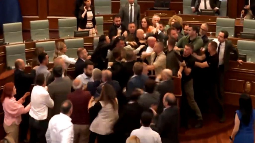 Ο αναπληρωτής πρωθυπουργός Μπεσνίκ Μπισλίμι σηκώθηκε από τα κυβερνητικά έδρανα, ξεκόλλησε τη φωτογραφία και την έσκισε επιδεικτικά. Έτερος βουλευτής του Δημοκρατικού Κόμματος πλησίασε τον Άλμπιν Κούρτι κρατώντας ένα μπουκάλι με νερό και τον κατάβρεξε. Ο Μπισλίμι αντιδρώντας εκσφενδόνισε ένα γυάλινο μπουκάλι που πέτυχε στο κεφάλι τον βουλευτή του Δημοκρατικού Κόμματος. Ακολούθησε γενική σύρραξη ανάμεσα στους βουλευτές της συμπολίτευσης και της αντιπολίτευσης με σπρωξίματα και γροθιές μέχρι που επενέβη η φρουρά της Βουλής.