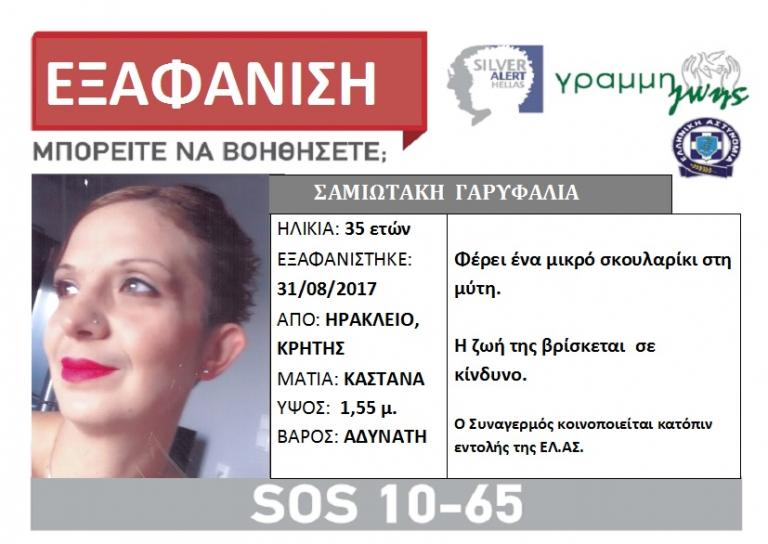 Αίσιο τέλος είχε η εξαφάνιση της 35χρονης Γαρυφαλιάς Σαμιωτάκη, τα ίχνη της οποία είχαν χαθεί από τις 31 Αυγούστου στο Ηράκλειο. Η μητέρα δυο παιδιών μετά από 10 μέρες αγωνίες εμφανίστηκε.