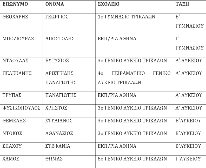 Οι μαθητές που προκρίθηκαν είναι οι ακόλουθοι: