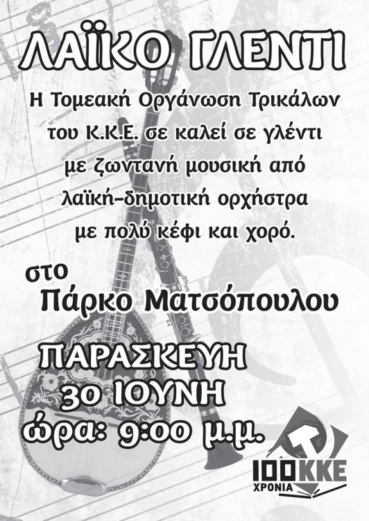 Οι Τομεακές Οργανώσεις Τρικάλων του ΚΚΕ και της ΚΝΕ διοργανώνουν την Παρασκευή 30 Ιούνη ένα καλοκαιρινό γλέντι με λαϊκή και δημοτική ορχήστρα , με πολύ κέφι και χορό.