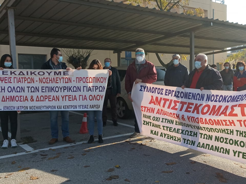 Κρατώντας πανό με υνθήματα υπέρ της ενίσχυσης της δημόσιας υγείας στη μάχη κατά της πανδημίας και απαιτώντας περεταίρω στελέχωση με ιατρονοσηλευτικό προσωπικό εργαζόμενοι που ήρθαν από όλα τα θεσσαλικά νοσοκομεία με πούλμαν πραγματοποιούν αυτή την ώρα συγκέντρωση έξω από τα γραφεία του dιοικητή της 5ης ΥΠΕ κ. Φώτη Σερέτη, από τον οποιο ζητούν να ενιχύσει με προσωπικό και μέσα τα πέντε δημόσια νοσοκοκμεία της Θεσσαλίας.
